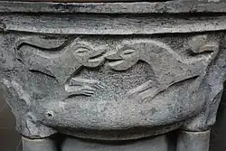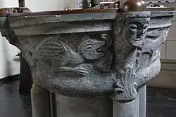 Das Taufbecken aus Namurer Blaustein ist 95 cm hoch. Das flache Becken zeigt unter vier derben Eckköpfen große Blätter an Stelle der Kapitelle für die flankierenden Säulen. Auf den Feldern dazwischen sind Fabeltiere dargestellt.