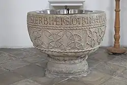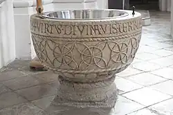 Der noch zum romanischen Stil gehörige Taufstein besteht aus einem großen Halbkugelbecken mit gedrungenem Fuß. Über dem muschelförmigen Beckenboden ist ein breites Band mit Flechtwerkornament, das aus Kreisen und Segmenten besteht, die in dünnen Stäben ausgeführt sind. Ein Schnurband bildet die untere und obere Begrenzung. Den Beckenrand umläuft folgende lateinische Inschrift (leoninischer Vers):