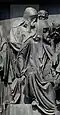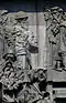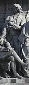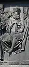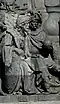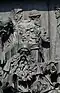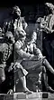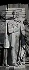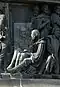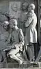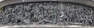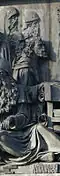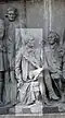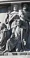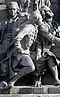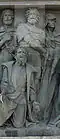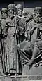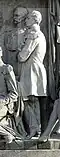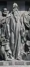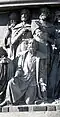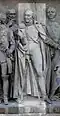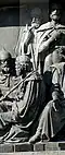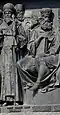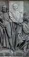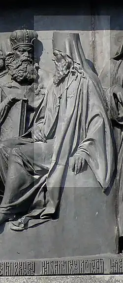 Gründung des unabhängigen russischen Zarentums | Основание самодержавного царства Русского | 1491 | Dargestellt ist Iwan der Große im byzantinischen Zarengewand und mit Mütze des Monomach. In den Händen hält er ein Zepter und einen Reichsapfel. Vor ihm kniet ein Tatare, daneben liegen der besiegte Litauer, der das Großfürstentum Litauen repräsentiert, sowie ein deutsch-baltischer Ritter mit gebrochenem Schwert, der für den Deutschen Orden steht. Die Gruppe blickt in Richtung Nordosten. |