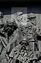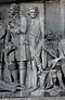 Beginn der Vertreibung der Tataren | Начало изгнания татар | 1380 | Dmitri Donskoi, der Sieger in der Schlacht von Kulikowo, hält in seiner rechten Hand einen russischen sechskantigen Streitkolben. Zu seinen Füßen liegt Mamai, der Emir der Goldenen Horde. In der linken Hand hält Dmitri Donskoi einen erbeuteten Buntschuk, das tatarische Machtsymbol. Die Komposition befindet sich auf der östlichen Seite. |