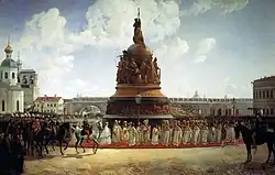 Die Eröffnung des Denkmals fand am 8. September 1862 statt. Die Vorbereitungen für den Feiern liefen seit dem Frühjahr. Nowgorod, das bis dahin eine ruhige Provinzstadt war, erfuhr eine spürbare Belebung: Überall tauchten Tausende von Arbeitern auf, die Häuser restaurierten und die Straßen und die Plätze reparierten. Eine Erneuerung und Restaurierung erfuhr auch der Nowgoroder Kreml. Ein wichtiges Antriebsmotiv war der erwartete Besuch des Zaren Alexander II. zur Monumentseröffnung.
