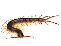 Die Tausendfüßer (Myriapoda, von griechisch μύριοι / μυρίος mýrioi / myríos, deutsch ‚zehntausend / sehr viel‘ und griechisch πούς pús, deutsch ‚Fuß‘, also eigentlich Zehntausendfüßer), eingedeutscht: Myriapoden oder Myriopoden,[1] im allgemeinen Sprachgebrauch auch Tausendfüßler, sind ein Unterstamm der Gliederfüßer (Arthropoda). Sie umfassen ausschließlich landlebende Formen mit einer meist zwei- oder dreistelligen Anzahl von Beinen. Lange Zeit galt Illacme plenipes aus der Doppelfüßer-Ordnung Siphonophorida mit maximal 750 Beinen als der Tausendfüßer mit den meisten Beinen. Im Jahr 2021 wurde in Australien mit Eumillipes persephone[2] erstmals ein Tier mit mehr als 1000 Beinen gefunden (gezählt wurden 1306 Beine). E. persephone gehört zur Doppelfüßer-Ordnung Polyzoniida und lebt genau wie Illacme plenipes im Bodeninneren (euedaphisch) bzw. in Höhlen (troglobiont). Dabei hilft die hohe Anzahl an Beinen, genug Kraft aufzubringen, um sich durch das Bodenmaterial zu graben.[3]