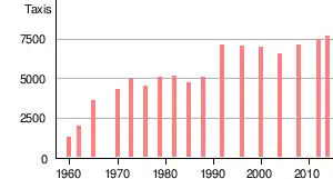 Im März 2014 gab es in Berlin rund 7600 Taxis[7] (1960: 1172 Taxis, Januar 2012: 7397 Taxis, siehe Grafik) und etwa 18.000 Fahrer.[8]