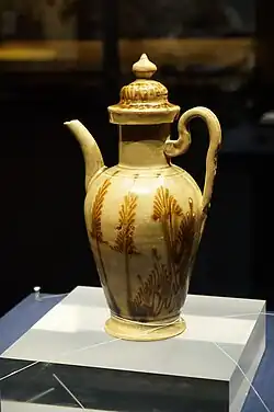 1391 verbot Kaiser Hongwu, der Begründer der Ming-Dynastie, die Tributzahlung in Form von gepresstem Tee, da dessen aufwändige Herstellung „die Kräfte des Volkes überfordere“. In Zukunft sollten lose Teeblätter als Tribut entrichtet werden.[8] Zhu Quan, ein Sohn Hongwus, der ein zurückgezogenes Leben als Einsiedler führte, begründete eine neue Schule der Teekunst: Lose, getrockneter Blätter wurden jetzt direkt aufgegossen. Die zu seiner Zubereitung notwendigen Gerätschaften erfuhren besondere Aufmerksamkeit, oft arbeiteten Gelehrte mit Künstlern zusammen, um Gefäße und Geräte nach ihren Vorstellungen zu gestalten. Die neue Zubereitung erforderte die Entwicklung eines besonderen Gefäßtyps: Erstmals wurden spezielle Teekannen aus Porzellan oder unglasiertem Ton gefertigt. Während am Kaiserhof und in den Residenzen des Hochadels Teegeschirr aus Porzellan oder Edelmetallen gebräuchlich war, erfuhren Tonkannen aus Yixing besondere Wertschätzung unter Gelehrten und Intellektuellen.[9]