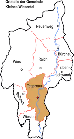 Im Gebiet der früheren Gemeinde Tegernau liegen die Dörfer Tegernau, Niedertegernau[1] und Schwand[2], der Zinken Käppeli[3] und das Einzelhaus Kuhnigraben[4]. Im früheren Gemeindegebiet liegen die abgegangenen Ortschaften Steiningen[5] und Wolfgeringen[6] und bei Tegernau die abgegangene Burg Neu-Waldeck der Herren von Waldeck, von der noch geringe Reste erhalten sind.[7]