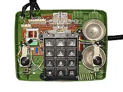 Schließlich besitzt ein Telefon eine Klingel. Früher arbeitete diese elektromagnetisch, durch einen Kondensator von der Telefonnetz-Gleichspannung entkoppelt, direkt an der zur Signalisation bereitgestellten, der Gleichspannung überlagerten Ruf-Wechselspannung von 25 Hz (Deutschland). Heute erfolgt die Auswertung dieser bei analogen Telefonanschlüssen auch heute noch verwendeten Rufspannung meist elektronisch.