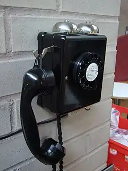 Ein Telefon, in älterer Schreibung Telephon (von altgriechisch τῆλε tēle „fern“ und φωνή phōnē „Laut, Ton, Stimme, Sprache“;[3] Begriff geprägt von Philipp Reis), auch Fernsprechapparat (kurz FeAp) oder Fernsprecher (bahninterne Abkürzung Fspr) genannt, ist ein in seiner modernen Form 1876 von Alexander Graham Bell entwickeltes Kommunikationsmittel zur Übermittlung von Tönen und speziell von Sprache mittels elektrischer Signale. Die Begriffe Fernsprecher und Fernsprechapparat gehen auf das Wirken des Generalpostdirektors und Sprachpflegers Heinrich von Stephan zurück. Zur Unterscheidung vom Mobiltelefon wird heute auch häufig das Retronym Festnetztelefon verwendet.