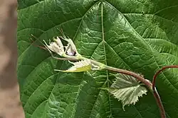 - Triebspitze: halboffen bis offen, weißlich grün mit leicht rötlich-braunem Hauch, karminrötlich berandet, flaumig-wollig und borstig behaart.