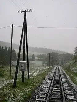 drahtleitungen und Kasten für Streckentelefon (Fernsprecher) an der Preßnitztalbahn. Dahinter ein kreuzendes Luftkabel