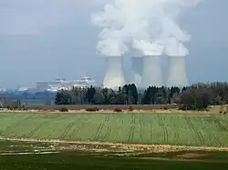 1910 lebten in der Gemeinde 555 Einwohner, davon waren 554 Tschechen und ein Deutscher.[8] Am 30. November 1914 wurde der Ortsname auf Antrag des Gemeinderates in Temelín/Temelin geändert. Während der deutschen Besetzung wurde 1943 Temelínec eingemeindet, 1945 wurde dies wieder aufgehoben. Nach der Aufhebung des Okres Týn nad Vltavou wurde Temelín 1961 dem Okres České Budějovice zugeordnet. Lhota pod Horami, Sedlec und Temelínec wurden am 12. Juni 1960 zu Ortsteilen von Temelín. Chvalešovice (mit Malešice) wurde am 1. April 1976 eingemeindet. Am 1. Juli 1985 erfolgte die Eingemeindung von Březí u Týna nad Vltavou (mit Knín, Kočín, Křtěnov, Litoradlice, Podhájí und Zvěrkovice), zugleich wurden Chvalešovice und Malešice nach Dříteň umgemeindet.[9] Nachfolgend wurden für den Bau eines Kernkraftwerkes in der Flur Temelínec die innerhalb einer Zwei-Kilometer-Sperrzone gelegenen Dörfer Březí u Týna nad Vltavou, Knín, Křtěnov, Podhájí und Temelínec ausgesiedelt. Die Bewohner sollten zum großen Teil in die neue Plattenbausiedlung sídliště Hlinecká in Týn nad Vltavou umsiedeln. Als alternatives Angebot seitens des staatlichen Energieversorgers ČEZ, der zu sozialistischen Zeiten die Rechte zur Umsiedlung der fünf Dörfer übertragen bekam, wurde den Bewohnern der Dörfer eine geringe Zahlung angeboten.[10] Nach der Aussiedlung wurden die Dörfer abgerissen, lediglich von Křtěnov blieben Kirche, Pfarrhaus und Friedhof erhalten. Das Kernkraftwerk wurde im Jahre 2000 in Betrieb genommen.