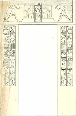 Die Türpfosten links und rechts der Eingangstür geben in je zwei unterschiedlich beschädigten Kolumnen von Hieroglyphen spiegelbildlich dieselben Widmungsinschriften wieder. Auf den inneren Kolumnen steht: „Horus, starker Stier, der als Maat erscheint, der König von Ober- und Unterägypten, der Herr der beiden Länder, Neb-maat-Re, ... geliebt.“ Außen heißt es: „Die beiden Herrinnen, der den Gesetzen Bestand gibt, der die beiden Länder beruhigt, der Sohn des Re, von seinem eigenen Leib, [Amenophis (‚Amun ist zufrieden‘), Herrscher von Theben], ... geliebt.“ Im Gegensatz zum linken Türpfosten ist auf dem Türsturz die von Sethos I. aufgesetzte Kartusche des eigenen Thronnamens Men-maat-Re noch kenntlich. Die Namen der zwei daneben thronenden Göttinnen hingegen fehlen. Vor der linken Göttin ist der König, ursprünglich sicher Amenophis III., beim rituellen Vasenlauf, vor der rechten Göttin beim Ruderlauf zu sehen.[8] Wie die Abbildung Chaemwasets vor Ramses II. anlässlich dessen fünften Thronjubiläums im 41. Regierungsjahr auf der rechten Seite des Eingangs,[9] scheinen auch die Einschnitzungen von Schiffen neben dem linken Türpfosten aus der Zeit nach der Restaurierung Sethos’ I. zu stammen.[10]