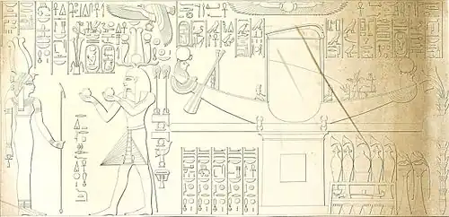 An dieser Stelle muss darauf hingewiesen werden, dass in dem durch Sethos I. restaurierten Zustand des Tempels die Göttin Nechbet in zwei verschiedenen Formen vorkommt. Neben der Hauptform erscheint Nebet-ra-inet (Nbt r3 jnt ‚Herrin des Taleingangs‘), eine Verkörperung des säugenden Aspekts der Nechbet, der in diesem Tempel besonders verehrt wurde. Nebet-ra-inet ist eine Abspaltung der Nechbet, entspricht aber ikonografisch der Göttin. Der Ägyptologe Wolfgang Waitkus sieht in ihr, in Bezugnahme auf die Schrift Necheb und Nechbet: Untersuchungen zur Geschichte des Kultortes Elkab von Hartwig Hartmann, eine Hathorform, die mit der Ortsgöttin Nechbet eine Verbindung eingegangen ist.[8] Die Göttin Hathor (Ḥwt Ḥr ‚Mutterschoß des Horus‘) verkörperte in der altägyptischen Religion eine allumfassende Muttergottheit.