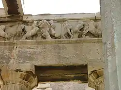 Die östliche Vorhalle wies weitere Besonderheiten auf. So wurde über dem Architrav, der die Anten des Pronaos verband, ein ionischer Fries angebracht. Dieser endete jedoch nicht, wie zu erwarten, an den Antenecken, sondern wurde, wie der zugehörige Architrav, über die Seitenptera hinaus verlängert und an den Gebälkinnenseiten der Vorhalle fortgeführt. Oberhalb des verlängerten Pronaos-Architravs trägt er figürliche Szenen – Göttergruppen als Zuschauer mythischer Kämpfe –, während er sich an den verbleibenden drei Seiten der Vorhalle als glattes blaues Band fortsetzt. Diese zwei Joche tiefe Vorhalle wird hierdurch deutlich von dem übrigen Baukörper, von den Seitenptera der Ringhalle, als eigenständig abgesetzt, was in dieser Form einzigartig ist. Auch über dem Architrav des rückwärtigen Opisthodoms war ein figürlicher Fries mit der Darstellung einer Kentauromachie angebracht, endet dort aber, wie zu erwarten, über den Anten. Beide ionische Friese wurden unten und oben von ionischen Eierstäben gerahmt, und auch der Wandfuß der Cella wies einen solchen ionischen Fries auf. Die Häufung ionischer Elemente an diesem ansonsten streng dorischen Bau ist bemerkenswert.