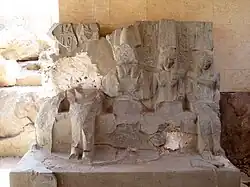 An der Rückseite der zweiten Pfeilerhalle, der Südwestseite, führen drei Türöffnungen zu den Kapellen der drei Hauptgötter des Tempels. Das mittlere Heiligtum galt der Verehrung des Osiris, links daneben befand sich der Raum, der Horus geweiht war, rechtsseitig die Kapelle der Isis.[10] Vor dem Eingang des Osirissanktuars wurde nachträglich eine Alabasterstele errichtet, die ursprünglich nicht in diesen Tempelteil gehörte. Von der ehemaligen Alabasterauskleidung des Heiligtums ist kaum noch etwas vorhanden. Das Steindach fehlt ebenso und wurde durch ein Holzbalkendach zum Schutz vor Witterungseinflüssen ersetzt.
