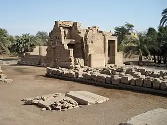 In der Zeit des Neuen Reiches ließ Thutmosis III. nördlich der vom Tempel zum Nilufer führenden Prozessionsstraße eine Barkenstation errichten. Sie wurde durch seine Nachfolger Amenophis II., Sethos I., Amenmesse, Ramses III. und Ramses IV. in unregelmäßigen Abständen instand gesetzt.[4] Viele Steinblöcke des Bauwerks wurden später bei der Errichtung der Kirche von Deir Anba Ibschai verwendet.[5] Außerhalb des heute freigelegten Geländes wird unter einer Moschee ein größerer Tempelbau Thutmosis’ III. vermutet.[1]