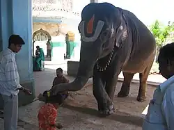 - ↑ „The elephant is made to stand in the temple premises for work such as blessing devotees...“. Surendra Varma, S. R. Sujata, M.C. Sathyanarayana, E.K. Easwaran, T.S. Rajeev, Mahesh Agarwal, N. Mohanraj, Nilesh Bhanage: Captive Elephants of Temples of India - An Investigation into the Status, Management and Welfare Significance, CUPA/ANCF-Technical Report No 13. Compassion Unlimited Plus Action (CUPA) and Asian Nature Conservation Foundation (ANCF), Bangalore, India, 2009, S. 10
