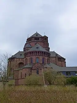 Zentrum des Innenraumes ist der Altar in der Apsis. Auf der Vorderseite des mit Flecht- und Rankenwerk geschmückten Stipes ist das Christusmonogramm mit Strahlen- und Wolkenkranz im Zentrum zu sehen, umgeben von zwei Medaillons mit einem Kelchrelief (rechts) sowie einer Schale mit Brot (links). Die äußeren Symbole weisen auf das letzte Abendmahl Jesu und seinen Opfertod am Kreuz hin. Das Christusmonogramm selbst soll Konstantin der Große nach einer Vision, in der ihm gesagt wurde „In diesem Zeichen wirst du siegen“, seiner Armee befohlen haben, es auf die Schilde und das neu als Feldzeichen eingeführte Labarum zu malen. Das geschah entweder vor der entscheidenden Schlacht bei der Milvischen Brücke gegen Maxentius im Jahr 312 oder vor der entscheidenden Schlacht gegen Licinius bei Chrysopolis.[35] Ein versteckter Hinweis auf den deutschen Kaiser, der sich sowohl als „Summus Episcopus“ verstand, als auch sich in einer gewissen religionspolitischen Ahnenreihe zu Konstantin sah, könnte hier mitgedacht werden.