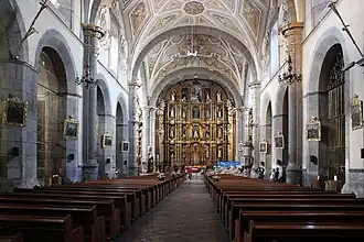 Die Apsis und die gesamte Kirche wird von einem enormen vergoldeten Hochaltar in klassisch-frühbarocken Formen beherrscht, dessen Nischen in vier Etagen von zahlreichen farbig gefassten Heiligenfiguren bevölkert werden. In den Querschiffen befinden sich reich geschnitzte und ornamentierte Barockaltäre im Churriguera-Stil.