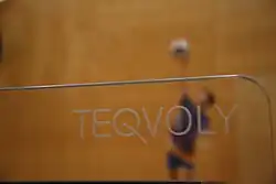 Teqvoly wird mit zwei Mannschaften aus jeweils zwei Spielern gespielt.[1][2] Im Mittelpunkt der sechseckigen Spielfläche steht ein Tisch mit nach oben gebogener Oberfläche, der ähnlich wie ein Tischtennistisch aussieht; das „Netz“ besteht aus Plexiglas.[1] Der Aufschlag erfolgt hinter der Grundlinie, beide Füße müssen dabei den Boden berühren und sich hinter der Servicelinie befinden.