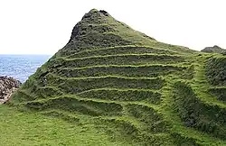Eine Küstenterrasse oder Meeresterrasse entsteht im unmittelbaren Uferbereich von Meeresküsten durch eustatische Meeresspiegelschwankungen oder durch Landhebungen, meist ausgelöst durch tektonische Prozesse, wie Erdbeben.[7] Die verebneten Flächen, die schwach zum Meer hin geneigt sind, stellen häufig fossile Ufer- und Strandbereiche dar. Gegenwärtig befinden sich diese Terrassenflächen nicht im Einflussbereich der Wellenbewegungen. Neben Terrassenflächen, die sich oberhalb der heutigen Uferlinie befinden, können auch Terrassen unterhalb des heutigen Meeresspiegels ausgebildet sein, die beim Anstieg des Meeresspiegels überflutet wurden. Küsten- und Meeresterrassen können sowohl durch Akkumulation von Strandsedimenten (Strandterrasse) als auch durch Erosion infolge von Wellenbewegungen entstanden sein. Während die Akkumulation von Küstenterrassen in der Regel einen langen Zeitraum in Anspruch nimmt, kann die Erosion ein sehr kurzfristiges Ereignis darstellen. Felsabbrüche bei Sturmfluten und Tsunamis können die Verebnungsflächen innerhalb kürzester Zeit verändern und zerstören.