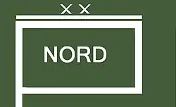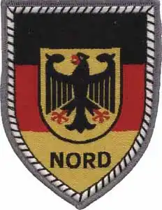 - „Von einer silbernen Kordel mit eingeflochtenem schwarzen Faden gefasst, geteilt zu Schwarz, Rot, Gold in goldenem Mittelschild ein einköpfiger schwarzer Adler, den Kopf nach rechts gewendet, die Flügel offen, aber mit geschlossenem Gefieder, Schnabel, Zunge und Fänge von roter Farbe (Bundesadler); der Mittelschild unten begleitet von Wort NORD in schwarzen lateinischen Großbuchstaben.“