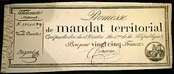 Offiziell wurden Assignaten gegen Territorialmandate zu einem Wechselkurs von 30:1 bewertet. Die Territorialmandate, die ihre Inhaber zum Erwerb von Nationalgut berechtigten und die der Staat anfänglich in einem Umfang von 2,4 Milliarden Franc emittierten ließ, wurden bald in großem Umfang gefälscht und unterlagen innerhalb von sechs Monaten einer rapiden Inflation. Auf dem Schwarzmarkt wurden Assignaten gegen Territorialmandate im Verhältnis von 300:1 getauscht. Bereits am 4. Februar 1797 verloren die Territorialmandate die Eigenschaft als gesetzliches Zahlungsmittel. Assignaten und Territorialmandate wurde am 21. Mai 1797 endgültig demonetisiert. Die Krise beendete die französische Regierung mit der Rückkehr zum Münzgeld: 100 Livres in Territorialmandaten waren nur noch 20 Sous in Münzen wert.[2]