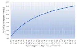 Der Bund gab im Jahre 2017 für alle Hochschulen (öffentliche und private) insgesamt etwas mehr als 40 Mrd. US$; diese Summe setzt sich zusammen aus Mitteln des Sozialministeriums, des Verteidigungsministeriums, der National Science Foundation und anderer Bundeseinrichtungen.[59] Im bevölkerungsreichsten Bundesstaat Kalifornien z. B. erhielten die Privatuniversitäten aus Washington 1,05 Mrd. US$, darunter allein Stanford 0,71 Mrd. US$, gefolgt von Caltech mit 0,28 Mrd. US$; die öffentlichen Hochschulen wurden mit 3,05 Mrd. US$ gefördert (Netz der University of California: 2,87 Mrd. US$, Netz der California State University: 0,17 Mrd. US$). Die am großzügigsten geförderte Einzeleinrichtung des Landes war die Johns Hopkins University (2,18 Mrd.) in Baltimore, Maryland.[59]