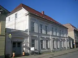 Das zweigeschossige achtachsige verputzte klassizistische Wohnhaus mit einem Krüppelwalmdach in der Nähe zum Neuen Tor stammt vom Anfang des 19. Jahrhunderts und war Stadthaus und Witwensitz im Eigentum einer ländlichen Adelsfamilie.