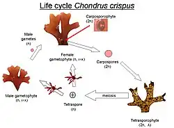 - dem ersten diploiden Sporophyten (wörtlich: „die Sporen produzierende Pflanze“): Diese Generation der Rotalgen wird der besseren Unterscheidung halber Karposporophyt genannt;