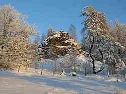 Der Teufelstein ist ein 200 m langer Phonolithdurchbruch mit Einschlüssen von Glimmerschiefer im örtlichen Buntsandstein. Die in seiner Nähe umherliegenden Phonolithblöcke bilden zum Teil fünf- bis sechskantige Säulen.[5] Durch deren bizarre Formationen erhält der Berg seinen besonderen touristischen Reiz.