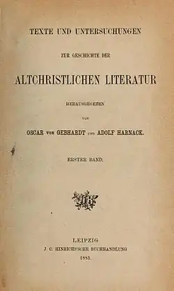 Vollständiger Titel: Texte und Untersuchungen zur Geschichte der Altchristlichen Literatur. Archiv für die von der Kirchenväter-Commission der Kgl. Preussischen Akademie der Wissenschaften unternommene Ausgabe der älteren christlichen Schriftsteller. Herausgegeben von Oscar von Gebhardt und Adolf Harnack.