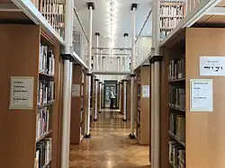 Das Gebäude beherbergt auch die Textilbibliothek. In den Schränken im Bibliothekssaal stehen tausende Musterbücher mit Textilmustern von Schweizer Firmen. Die über zwei Millionen Originale[2] dokumentieren die Maschinenstickerei des späten 19. und frühen 20. Jahrhunderts, der Blütezeit der St. Galler Stickereiindustrie. Auch Stoffdruck und Weberei sind mit zahlreichen Beispielen vertreten. Dazu kommen Modefotografien und -illustrationen, Naturstudien, Tapetenmuster und Entwurfszeichnungen.