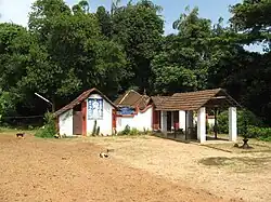 Indilayappan Kavu. Schrein mit altem heiligem Wäldchen (kavu) dahinter. Im Dorf Punthalathazham in der Nähe von Kollam