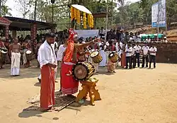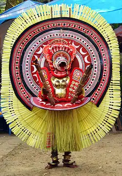 Mitglieder der Panar-Kaste führen das Drama der Götter-Verwandlung im Distrikt Kozhikode auf, sie sind mit den Malayans verwandt, die weiter nördlich Bhairavan Teyyam und Kuttichathan Teyyam[38] mit jeweils nur einer Gottheit veranstalten. Kuttichathan wird ebenso von Brahmanen verehrt wie von niederkastigen Hindus und Mopillas (Muslimen). Muslimische Fischer bitten ihn als mächtigen Geist um einen reichen Fang.[39][40]