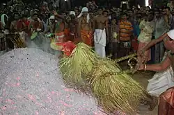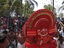 Im Kalarivathukkal-Tempel helfen viele Teilnehmer, mit Bambusstangen die über 15 Meter hohe Krone (muti oder mudi) der zum Umfeld von Kali gehörenden Göttin Bhagavathi aufzustellen und sorgen dafür, dass der Tänzer sich mitsamt der Konstruktion im Kreis drehen kann. Im Hintergrund die auf ebensolche Weise verehrten Kinder der Göttin.
