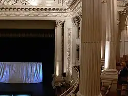 Streng hierarchisch wurden die verschiedenen Elemente angeordnet, die doch ein zusammenhängendes Ganzes bildeten.[51] Direkt vor der Bühne gab es Platz für das Orchester und die Garde, dann im Parkett die abgegrenzte königliche „Loge“ (der Begriff stand damals eigentlich für jede Sitzgelegenheit).[52] Zu jener konnte Ludwig sich auch durch einen unter dem Boden verborgenen Gang zurückziehen, nachdem er auf der Bühne getanzt hatte.[53] Zum hinteren Ende hin gab es Sitzreihen in Stufenanordnung für die Angehörigen des Hofs. Hufeisenförmig umfingen den Saal übereinander zwei Ränge, jeweils unterstützt durch Säulenreihen.[54] Durch schmale Gänge mit eigenen Eingangstüren konnten Sonderbotschafter, Gesandte und ausländische Minister zu ihnen extra zur Verfügung gestellten Balkonen gelangen.[55] Blondel hatte die Kombination von Säulen mit rundem und quadratischem Querschnitt kritisiert,[56] lobte aber die große Schönheit der Kassettendecke mit Gemälden, ausgeführt von Noël Coypel nach Entwürfen von Charles Errard. Die Beleuchtung bestand aus dreißig Kronleuchtern, die durch eine von Carlo Vigarani gebaute Vorrichtung nach Beginn der Vorstellung an die Decke gezogen wurden.[57]