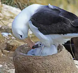 Wie fast alle Albatros-Arten nisten Schwarzbrauenalbatrosse in Kolonien, die oft aus mehreren tausend Vögeln bestehen, dabei kann es auch vorkommen das gemischte Kolonien aus Felsenpinguin und Albatros entstehen (Falklandinseln). Die Falklandinseln gehören zu den wichtigsten Brutgebieten der Art. Vermutlich brüten etwa 75 Prozent des Weltbestandes auf den Inseln dieses Archipels. Für die dortige Avifauna stellt der Schwarzbrauenalbatros die zweithäufigste Brutvogelart dar.[4] Die bekanntesten Brutkolonien der Falklandinseln befinden sich hier[5]: