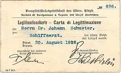 - ↑ Rakousky Lloyd v Terstu – Zabavni Cesty [Österreichischer Lloyd in Triest – Vergnügungsfahrten] und Mittelmeerdienst. beide: Österreichischer Lloyd, Triest 1908. Weitere Quellen in Periodika (ANNO-Digitalisate): Das Vaterland, 28. Februar 1908, Allgemeine Sport-Zeitung, 15. März 1908, Das Vaterland, 22. März 1908, Czernowitzer Allgemeine Zeitung vom 2. August 1908, Das Vaterland, 20. September 1908.