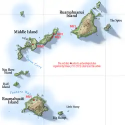 Während der ersten Erkundung der Aldermen Islands konnten frühe Beobachter wie Sladden, Falla[6][7] und Cochrane[8] keine sichtbaren Anzeichen einer früheren maorischen Besiedlung identifizieren. Die Untersuchungen von Bell et al. während der Jahre 1951–58 enthüllten jedoch faszinierende Hinweise auf beiden, Ruamahuanui und Middle Island. Captain Cook's historischer Bericht von 1769[9] bestätigte, dass die Inseln bewohnt waren, und Wades Beobachtungen von 1842[10], während eines vorübergehenden Aufenthalts auf Ruamahuaiti, notierten Überreste von Hütten und reichlich wildem Kohl in der Nähe von Tuatara Bay.