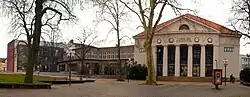 In den 1950er Jahren wurde dann ein moderner und für damalige Verhältnisse extravaganter Kinobau errichtet, der durch sein geschwungenes Spannbetonäußeres ein deutliches Gegengewicht zum benachbarten neoklassizistischen Stadttheater bildete. Bis zum Umbau in den 1970ern soll das gesamte Gebäude (fast) keine Wand mit einem rechten Winkel gehabt haben. Bis heute haben wesentliche Teile der mittlerweile denkmalgeschützten Glasfassade alle Umbauten überstanden.