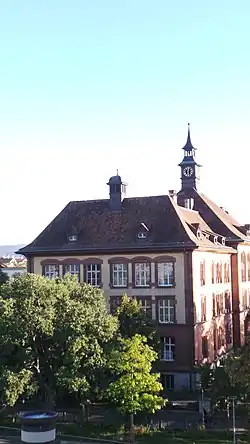 Das Theobald-Baerwart-Schulhaus im Matthäus-Quartier in Kleinbasel in unmittelbarer Nähe der Dreirosenbrücke.