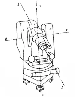 Der Theodolitunterbau oder Limbus enthält den Horizontalkreis (1) und die Vertikalachse (Stehachse) (S). Er trägt die Alhidade (arab.), den Oberbau bestehend aus zwei Stützen (2), der horizontalen Kippachse (K), dem Fernrohr (3), der Kreisablesung (4) und dem Vertikalkreis (5). Das Fernrohr hat ein Strichkreuz (Strichplatte im Okular), durch welches die Zielachse (Z) definiert ist, und eine Innenlinse zum Fokussieren (Scharfstellen).