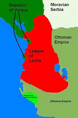 Vereinfachte Darstellung des Einflussgebiets der Liga unter Skanderbeg (1444–1479)