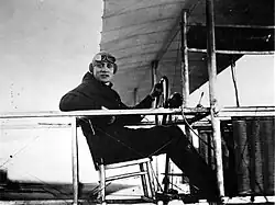 Theodor Schauenburg 1912 in Weimar auf einem selbstgebauten Doppeldecker. Als Pilotensitz dient ein abgesägter Küchenstuhl