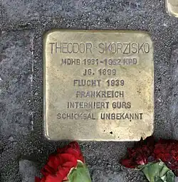 Zum Gedenken an die ermordeten Mitglieder der Hamburgischen Bürgerschaft verlegte Gunter Demnig am 8. Juni 2012 einen Stolperstein für Theodor Skorzisko links neben dem Haupteingang des Hamburger Rathauses.[2]