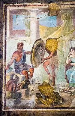Nachdem Achills Freund Patroklos von Hektor getötet worden war, besuchte Thetis Achill und beklagte mit ihm gemeinsam den Tod des Patroklos. Achilleus schwor Hektor Rache. Daraufhin suchte Thetis den Gott der Schmiedekunst Hephaistos auf, den sie einst groß gezogen hatte, und bat Hephaistos neue Waffen (eine Rüstung) für Achill anzufertigen, was dieser aus Dankbarkeit gegenüber Thetis befolgte. Diese Szene wird ausführlich im 18. Gesang der Ilias beschrieben, bekannt ist vor allem die Verzierung des Schildes von Achilleus mit Szenen aus dem damals zeitgenössischen griechischen Alltag. Thetis brachte ihrem Sohn die neuen Waffen, ermutigte ihn zum Kampf und wies ihn an, den Streit mit Agamemnon beizulegen. Den Leichnam des Patroklos konservierte Thetis mit Nektar und Ambrosia um ihn vor der Verwesung zu schützen.[6] Nachdem Achilleus Hektor getötet hatte, nahm er dessen geschundenen Leichnam mit in sein Lager, was die Götter erzürnte. Zeus holte Thetis in den Olymp und forderte sie auf ihren Sohn umzustimmen, was Thetis befolgte. Sie überredete ihren Sohn und dieser übergab den Leichnam an Hektors Vater Priamos.[7]