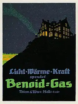 „Der Mangel an Gas und Wasser hält manchen davon ab, sich nach Bedarf eine Wirkungs- oder Wohnstätte zu gründen. Außerhalb der Städte ist es um die Gas- und Wasserverhältnisse meistens schlecht bestellt. Das empfinden nicht nur die Privatleute, die abseits vom Lärm der Großstadt sich ansiedeln wollen, sondern auch die Fabriken, Hotels, Sanatorien usw., die ihre Räumem in allen Einrichtungen mit neuzeitlichem Komfort und moderner Hygiene ausstatten müssen. Jedoch kann ihnen allen geholfen werden durch eine moderne Gas- und Wasserversorgungsanlage wie sie die Benoid-Gas- und Wasserapparate der Firma Thiem & Töwe in Halle (Saale) herstellen. Die Anlagen ersetzen die städtische Gas- und Wasserleitung in jedem Falle und ermöglichen sämtliche Bequemlichkeiten, wie Beleuchten, Heizen, Kochen, Braten, Backen und Plätten mit Gas, Badeeinrichtungen, heißes und kaltes Wasser in allen Räumen, Klosettspülung usw. Benoid-Gas- und Wasseranlagen sind nicht nur im Haushalt, sondern auch in Tausenden von Fabriken, Laboratorien und anderen gewerblichen Betrieben zur Beheizung und Wasserversorgung von Maschinen usw. tätig. Die Apparate arbeiten in einer unbeschränkten Anzahl von Flammen. Zapfstellen; sie sind einfach zu installieren und lassen sich allen Verhältnissen bequem anpassen. Prospekte und Kataloge, in denen alles Nähere enthalten ist, versendet die genannte Firma kostenlos.“