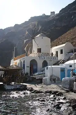 Die Ausflugsboote der Touristen von Santorin legen üblicherweise im winzigen Hafen Ormos Korfou unterhalb des Dorfes an. Von hier führt ein steiler Treppenweg hinauf zum Dorf, der auch mit Hilfe von Maultieren bzw. Eseln bewältigt werden kann. Tatsächlich findet man hier einen der wenigen organisierten „Parkplätze“ für Esel und Maultiere, die von ihren Treibern auf ebener, überdachter Fläche abgestellt und mit Wasser versorgt werden. Das Dorf selbst hat einige Tavernen und bietet eine herrliche Aussicht über die Caldera auf Santorin. Übernachtungsmöglichkeiten stehen nur in sehr begrenzter Zahl zur Verfügung.[3]