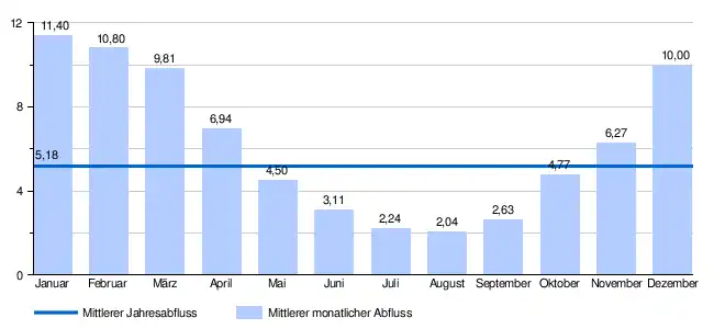 Die Abflussmenge schwankt im Lauf des Jahres recht stark. Die höchsten Wasserstände werden in den Monaten Dezember – März gemessen. Ihren Höchststand erreicht die Abflussmenge mit 11,40 m³/s im Januar. Von April an geht die Schüttung Monat für Monat zurück und erreicht ihren niedrigsten Stand im August mit 2,04 m³/s, um danach wieder von Monat zu Monat anzusteigen. Der jahresdurchschnittliche Wert beträgt hier 6,19 m³/s.