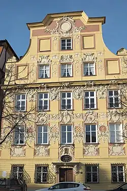 Das dreigeschossige Wohnhaus besitzt einen reichen Stuckdekor an der Fassade. Das Haus mit fünf Achsen und zweigeschossigem Giebel wird über dem Portal mit Oberlicht von einer Nische geschmückt, in der sich eine Madonna mit Kind befindet.